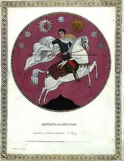 In May 1918, the Democratic Republic of Georgia – newly independent from the Russian Empire – chose the equestrian depiction of Tetri Giorgi as a centerpiece of its coat of arms. But the image was rendered more secular as its Christian symbolism was disfavored by Georgia's Social-Democratic government, recalls Revaz Gabashvili, a critic of the contemporary Georgian government.[6] In this design, Tetri Giorgi is shown as an armed horseman below a depiction of "the Seven Celestials" (the seven classical planets).