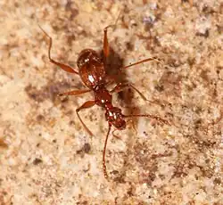 The introduction of invasive species, mainly the red fire ant, has been known to disrupt the beetle's environment. Shallow caves in which the beetle live are relatively easy to enter and make them vulnerable to invasion of fire ants and other exotic species. Fire ant colonies occur in two different forms: single-queen colonies and multiple-queen colonies. It is the multiple-queen colonies that pose a threat because they occur in very dense concentrations of about 750–5000 mounds per acre. They can enter through the cave entrance or crawl through small holes or cracks and attack the karst species where humans cannot observe. Slow moving adults, nymphs, and eggs are most vulnerable to fire ant predation. More than 50% of the caves observed had fire ants present. This is a large sign that the fire ant has taken over or will eventually take over the habitat. Even if the fire ant does not prey on the beetle it is likely to change the links that are critical in the food chain.