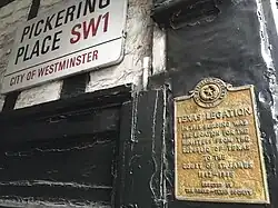 The Texas Legation in London was located in Pickering Place, an alley off the east side of St. James's Street near St. James's Palace in a building that also houses Berry Bros. & Rudd, a prestigious wine merchants' firm that has been at that site since 1698. On the north side of the building is a plaque marking it as the site of the legation. At the top of the plaque is the seal of the Republic of Texas. The text of the plaque reads: "Texas Legation In this building was the legation for the ministers from the Republic of Texas to the Court of St. James 1842 - 1845. Erected by the Anglo-Texan Society".