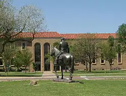 One of the most well-known landmarks on campus is the statue of Will Rogers on his horse Soapsuds. The statue, created by Electra Waggoner Biggs, has resided at the center of the campus since it was dedicated on February 16, 1950 by Rogers' longtime friend Amon G. Carter.[11][12] Carter claimed that Texas Tech was the ideal setting for the statue and that it would be an appropriate addition to the traditions and scenery of West Texas.[13] The statue, estimated to cost (in 1950) $25,000, stands 9 feet 11 inches (3.02 m) and weighs 3,200 pounds (1,450 kg).[14] The inscription on the plaque at the base of the statue reads: "Lovable Old Will Rogers on his favorite horse, 'Soapsuds', riding into the Western sunset."