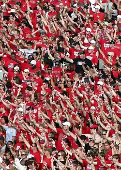 - ^ The "Guns Up" hand-sign is also displayed whenever an injured player goes down, whether it is a Texas Tech player or an opponent, and play is suspended. Students and fans continue holding their Guns Up until the injured player leaves the field or returns to action.