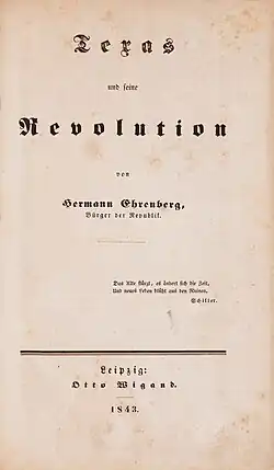 Ehrenberg's memoir was published in Leipzig, Germany by Otto Wigand in 1843 as Texas und Seine Revolution. It was reprinted without text changes in 1844 as Der Freiheitskampf in Texas im Jahre 1836 and in 1845 as Fahrten und Schicksale eines Deutschen in Texas.[15]