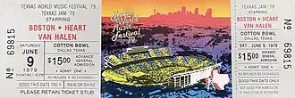 Notes: TKO was managed by the same management as Heart at the time, which is the reason for their appearance on the bill. KTXQ-FM Q-102 simulcast much of this concert throughout the day, with TKO, Hagar, Nazareth, and portions of Heart's show aired live. Van Halen's set was not broadcast. KTXQ had to unplug Heart's sound equipment for Boston's set, which they did before the band took the stage. As a result, only a portion of Heart's set was aired, the sound being broadcast from microphones placed around the Cotton Bowl.