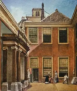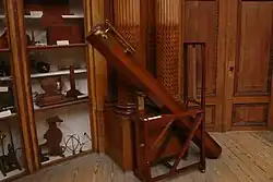 Though the observatory couldn't be used for precision measurements, it was still used for manual observations. The collection of the Teylers physical cabinet contains several telescopes and other devices that were used. Until 1817 the observatory also had a camera obscura, which was used for drawings of the view from the little tower.[2][3] Though they have not survived, the Teylers archives have evidence that Vincent Jansz van der Vinne was paid 86 guilders for painting the "walls and ceilings of the cupula".[3] That was not the only artwork that early stargazers met with when they climbed the stairs. On the rooftop of the first staircase a vase was installed that was delivered by Jan Woortman in 1781.[3] Though lost since, the vase can be seen in the painting of the courtyard of the Foundation house by Wybrand Hendriks. The vase was the trademark of Teyler, and is visible on the top of Van Marum's electrostatic generator as well.