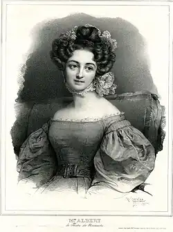 Thérèse Vernet (c. 1805-1846) was a French actress, widely known as Madame Albert from her marriage to Albert Rodrigues, an actor who performed under his given name.[1] Born to an acting family, she attained fame for her grace and beauty as well as for the range of her acting skills. Besides becoming the "idol of Paris" she was also well known in the provinces due to long theatrical tours she undertook outside the capital.[2] Ill-health compelled her to retire in 1846. In 1846 she married for the second time, to the actor and playwright Eugene Bignon (1812–1858).[1]