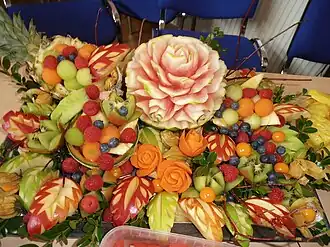Thai fruit carving (Thai: การแกะสลักผลไม้, Thai pronunciation: [kāːn.kɛ̀ʔ.sa.làk.pʰǒn.la.máːj]) is a traditional Thai art that requires neatness, precision, meditation, and personal ability. Fruit carving persisted in Thailand as a respected art for centuries.[1] It was originally used only to decorate the tables of the royal family.[2] Fruit carving is a popular custom practiced during Songkran.[3]