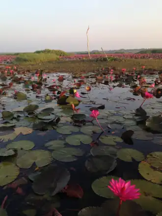 Royal or Sacred lotus, Nelumbo nucifera, are harvested extensively for food, medicine and religious ceremonies.[24] Thai people use all parts of this species for myriad uses including the rhizomes, stems, leaves, petals, pods and seeds in cooking; the flowers and leaves for Buddhist rituals; and the leaves, pods, petioles, stamens and pollen for treating a variety of ailments such as sinusitis, diabetes and fever.[24] Similarly, leaves from the Pandanus plant, Pandanus amaryllifolius, found within the reserve are commonly used throughout Thailand for flavouring dishes and adding natural green colouring to drinks and sweets,[20] as well as being used as a traditional medicine for treating diabetes.[25]