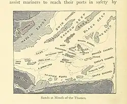The Nore Lightship, the world's first lightvessel, was established in the Estuary as a private venture in 1732 to mark the 'best position for entering the Thames and Medway, and to clear the Nore Sand'.[18] The coastwise approach from the north was aided by the establishment of the Sunk lightvessel in 1802 'to mark the north-east entrance to East Swin, and to guide vessels round Long Sand'. Later, the Swin channel was further marked by lightvessels at Swin Middle (1837) and Mouse (1838), and by screw-pile lighthouses on the Maplin Sands (1841) and at Gunfleet (1856).[19] Meanwhile, one of the outlying sandbanks of the Estuary was marked by a lightvessel at Kentish Knock (in 1840); and in due course the southern approach was marked by lightvessels at the Tongue (1847) and Girdler (1848) sands, with another being added (between these two) in the Princes Channel (1856). In 1851 two more screw-pile lighthouses were built further upriver, on the northern foreshore of Sea Reach: at Mucking and on the Chapman sands (just off Canvey Island).