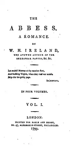 The Abbess: A Romance is a gothic novel by William Henry Ireland first published in 1799. The text was modelled upon Matthew Lewis's The Monk (1796).[1]