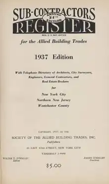 The company traces its roots to when Joseph O'Malley, president of The Society of the Allied Building Trades, first published a subcontractor's registry for New York City in 1913.[1] The Subcontractors Register for the Allied Building Trades was a directory of subcontractors for the New York City area, listing companies by their trade. It was published by Joseph O'Malley (1893–1985) who was later joined by his nephew, Walter Francis O'Malley, as editor.[2] The 1942 version calls itself: "A Classified List for the Allied Building Trades of Sub-Contractors, Material Dealers & Manufacturers, General Contractors & Builders, Architects — Engineers, Real Estate Management Firms".