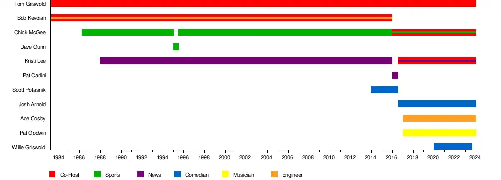For most of The Bob & Tom Show's 40-year history, the cast consisted of hosts Bob Kevoian and Tom Griswold, sports commentator and comic foil Chick McGee, news director Kristi Lee, and producer Dean Metcalf. Kevoian and Griswold originally teamed up in the early 1980s at Petoskey, Michigan station WJML[16] before being lured to WFBQ "Q95" Indianapolis in 1983 to host what was initially a music-heavy morning show.[17] Marty Bender then arrived as both Program Director and contributor. After McGee (in 1986) and Lee (in 1988) joined the show, the primary cast that listeners would know for decades simply as "Bob, Tom, Chick, and Kristi" was set.