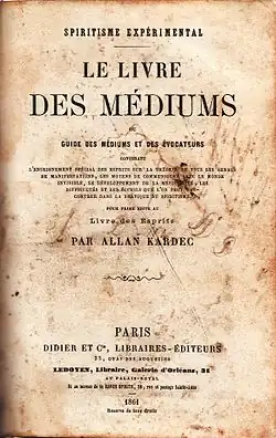 The Book on Mediums or Mediums and Evokers' Handbook (a.k.a. The Mediums' Book —Le Livre des Médiums, in French), is a book by Allan Kardec published in 1861, second of the five Fundamental Works of Spiritism — the philosophy Kardec had been publishing — being the tome in which the experimental and investigative features of the doctrine were presented, explained and taught.