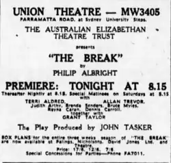 The Break is a 1962 Australian play by Philip Albright. Albright was an American writer and actor who had moved to Australia. He died in 1959 and the play debuted after his death.[4] It was an early Australian play to depict homosexuality.[5]