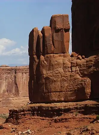 The Candelabrum is located within the Park Avenue section of Arches National Park and like many of the rock formations in the park, it is composed of Entrada Sandstone, specifically the Slick Rock Member overlaying the Dewey Bridge Member.[2] Topographic relief is significant as the summit rises 300 feet (91 meters) above the Park Avenue Trail in 300 feet (91 meters) laterally. Precipitation runoff from Candelabrum drains to the Colorado River via Courthouse Wash. The first ascent of the summit was made in November 1986 by Charlie Fowler and Chris Goplerud via Play with Fire rock-climbing route.[3] Kyle Copeland and Alison Sheets first climbed the class 5.11c A2 Hall of Flame route in 1986.[4][5] This landform was shown briefly in the opening scene of the 1989 American action-adventure film Indiana Jones and the Last Crusade.
