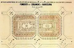 The projects submitted to the Barcelona City Council competition to design an expansion for the city focused, in most cases, its solution in the "road from Barcelona to Gracia" that for some time was being consolidated urbanistically as Passeig de Gracia and that conditioned the possible solutions. These plans, unlike the one proposed by Cerdá, occupied a smaller area and were intended to accommodate fewer people, which is logical if we think that they obeyed the objectives of the bourgeoisie to reinforce social segregation. Thus, the winning plan of the widening competition, presented by Rovira i Trias, corresponds to the slogan that headed it: "The layout of a city is more the work of time than of the architect"; and Rovira himself stated that the proletarians could not live in what "will have to be properly called the city of Barcelona".[17]