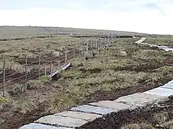 It is located in the Northumberland National Park and is 41 miles (66 kilometres) from the city of Newcastle-upon-Tyne.[12] It can be viewed in the distance from the peak of Cow Hill on the Town Moor, the city's largest park.[13] The mountain can also be viewed from most areas of Northumberland and from as far south as central County Durham. The Cheviot's summit boasts views of many upland areas such as the Lake District, including Scafell Pike (England's highest mountain) over 80 miles to the south-west, the North Pennines and the North York Moors in Northern England, as well as several in Scotland including the Ettrick Hills, the Pentlands and even the southern peaks of the Grampians and the Mounth.[12] The summit is a triangular plateau covered with peat quagmires.[14]