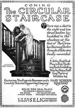 In 1912, Rinehart's friend Beatrice DeMille, mother of Cecil B. Demille, tried to work out a deal for her son's new film company to purchase the rights to The Circular Staircase and another Rinehart story. Though this failed to come together, Rinehart was soon able to sell her work to film companies, beginning with a group of comic stories that Essanay Studios adapted as short films in 1914.[6][7] In 1915, Rinehart sold the film rights to The Circular Staircase to Selig Polyscope Company for an apparently small amount.[8] The silent film, released in 1915, was the first feature-length adaptation of Rinehart's work.[6] It was directed by Edward LeSaint and starred Guy Oliver as Halsey, Eugenie Besserer as Ray, and Stella Razeto as Gertrude.[9] It received lukewarm reviews; one critic wrote that it followed the novel too closely to be effectively cinematic.[10] The film is now lost.[9]