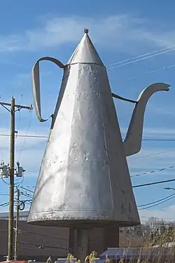 The Mickey Coffee Pot is a large tin coffee pot which is a local landmark in Winston-Salem, Forsyth County, North Carolina. The coffee pot was created in 1858 by tinsmiths Julius and Samuel Mickey as an advertisement for their tin shop on South Main Street.[1] The pot is considered to be a symbol of hospitality and an unofficial symbol of the city.[1][2]