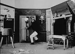 In a kitchen, a cook attempts to kiss a waitress, and she drops a whole stack of plates in her surprise. The panicking cook, hearing the head waiter coming, hides in a cupboard. He sticks his head out to hear the waiter's remonstrances about the broken plates, and the waiter slams the cupboard door shut. The cook's head, still very much alive, comes off and begins berating the astonished chef.