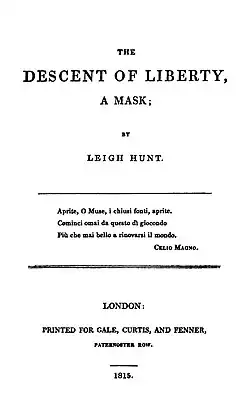 The Descent of Liberty was a masque written by Leigh Hunt in 1814. Held in Horsemonger Lane Prison, Hunt wrote the masque to occupy himself, and it was published in 1815. The masque describes a country that is cursed by an Enchanter and begins with shepherds hearing a sound that heralds change. The Enchanter is defeated by fire coming out of clouds, and the image of Liberty and Peace, along with the Allied nations, figures representing Spring and art, and others appear to take over the land. In the final moments, a new spring comes and the prisoners are released. It is intended to represent Britain in 1814, emphasising freedom and focusing on the common people rather than the aristocracy. Many contemporary reviews from both Hunt's fellow poets and literary magazines were positive, although the British Critic described the work as a "pert and vulgar insolence of a Sunday demagogue, dictating on matters of taste to town apprentices and of politics to their conceited masters".[1]