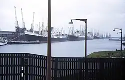 The West India Docks were established in 1803, providing berths for larger ships and a model for future London dock building. Imported produce from the West Indies was unloaded directly into quayside warehouses. Ships were limited to 6000 tons.[59] The old Brunswick Dock, a shipyard at Blackwall became the basis for the East India Company's East India Docks established there in 1806.[60] The Millwall Docks were created in 1868, predominantly for the import of grain and timber. These docks housed the first purpose built granary for the Baltic grain market, a local landmark that remained until it was demolished to improve access for the London City Airport.[61]