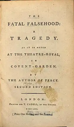 The Fatal Falsehood is a 1779 tragedy by the British writer Hannah More.[1] It premiered at the Theatre Royal, Covent Garden in London on 7 May 1779.[2] The original cast included Matthew Clarke as Earl Guilford, William Thomas Lewis as Rivers, his son, Richard Wroughton as Orlando, a young Italian Count, Francis Aickin as Bertrand, Elizabeth Younge as Emmelina and Elizabeth Hartley as Julia. The prologue was written by Richard Brinsley Sheridan.[3]