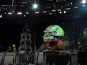 The walk-on Eddie, a regular fixture of the band's tours, appeared in his new incarnation as an extraterrestrial. Complete with an "Ed-cam" (a point of view camera which fed directly to the projector screens), the new Eddie was smaller than those of previous tours, and was the first to appear with a guitar on stage. Eddie broke his guitar in Valencia, the last date of the 2010 tour, during the song "Iron Maiden", although it was replaced in 2011.[45] In São Paulo, Rio de Janeiro, Buenos Aires, Santiago and throughout the second European leg a giant Eddie was used during "Iron Maiden", appearing at the back of the set with flashing eyes and hands gripping either side of the rear walkway (the walk-on Eddie, from that point, being used during "The Evil That Men Do").[46]