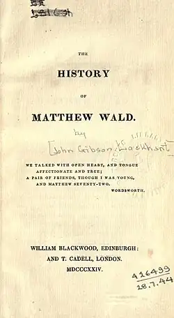The History of Matthew Wald is an 1824 novel by the Scottish writer John Gibson Lockhart originally published by William Blackwood.[1] [2] It was the fourth and last novel written by Lockhart, the son-in-law of Walter Scott. The novel is partly set in a lunatic asylum. It was influenced by the writings of William Godwin and resembles Justified Sinner by James Hogg, published the same year.[3]