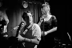 Paradise Rocks is a musical set in the 1960s "in the style of an Elvis movie" and is based on the 17th century epic poem Paradise Lost by John Milton. Written by Simon in 2014, the musical was not performed until 2018 owing to the logistical challenges involved. Unlike Book of Job: The Musical, Paradise Rocks required a larger number of actors, musicians and technicians.[68] The Indelicates, with The Devil's Party Theatre Company, performed the musical at venues in the UK through 2019, including the Ledbury Poetry Festival, the Brighton Fringe festival and in London.[90][92] For Fringe Review, Robin Manuell said that the musical was "the most all round entertaining show I have had the pleasure to see" and that the songs were "excellent". He also praised director Lex Lake and choreographer Roger Duncan for "the quality of the ensemble work". Manuell said that while the cast all had moments of excellence and the singing was of a high standard, during the performance he saw "not all the performers can keep this up all the time" and some were "patchy". He nevertheless concluded that Paradise Rocks was "an outstanding play and an outstanding production".[93]