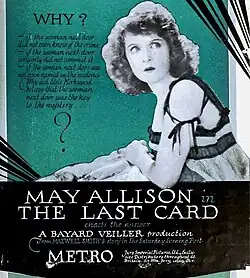The Last Card is an extant 1921 silent romantic drama film directed by Bayard Veiller and starring May Allison. It was produced and distributed by Metro Pictures to poor audience reception.[1]