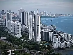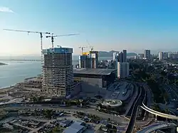 The 154-acre (62 ha) Light Waterfront encompassed the southernmost land parcel A1, which lies between the Green Lane interchange of the expressway and the Penang Bridge.[2] It was unveiled in 2007 as a development masterplan that drew inspiration from the Sentosa Cove development in Singapore.[1][2] The Light Waterfront masterplan was split into three phases. The first phase comprised residential developments within 42 acres (17 ha) of the southern part of the land reclamation.[3] The second phase – known as 'The Light City' – covered around 103 acres (42 ha), and included hotels, office towers, an RM80 million art gallery, a retail complex called 'The Waterfront Shoppes' and the Penang Waterfront Convention Centre (PWCC).[4][5][6] The PWCC is expected to be one of the largest convention centres in Penang, with a gross floor area of 270,000 sq ft (25,000 m2).[5] A seafront park made up the third phase of the masterplan.[3]
