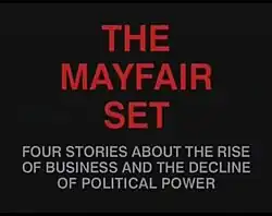 The Mayfair Set, subtitled Four Stories about the Rise of Business and the Decline of Political Power, is a BBC television documentary series by filmmaker Adam Curtis. It explores the decline of Britain as a world power, the proliferation of asset stripping in the 1970s, and how buccaneer capitalists helped to shape the climate of the Thatcher years, by focusing on Colonel David Stirling, Jim Slater, Sir James Goldsmith and Tiny Rowland—members of London's elite Clermont Club in the 1960s. It won a BAFTA Award for Best Factual Series or Strand in 2000.[1]