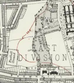 Then a London League side, Catford Southend used the ground from about 1909 until the start of World War I in 1914,[2] and then after the war[3] (the 1914 Ordnance Survey map shows the ground situated parallel to Laleham Road with its southern end just north of housing on Brownhill Road).[3]