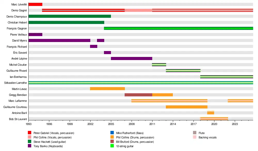 - Denis Gagné ("Peter Gabriel") 1995–present – lead vocals, flute, occasional percussion (he also represented Phil Collins as a vocalist during the Trick of the Tail tour, and did the same for the first act of the Genesis Extravaganza tour)