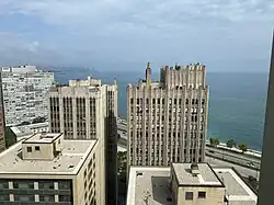 The Narragansett is a historic apartment building at 1640 E. 50th Street in the Kenwood neighborhood of Chicago, Illinois. The building was built in 1928 at the peak of apartment construction in Chicago, as apartments had grown in popularity throughout the early 20th century. It was one of several apartments built in the Chicago Beach Development, a lakefront property that was developed into a fashionable neighborhood known as Indian Village. Architects Leichenko and Esser designed the Art Deco building. The 22-story building features brick piers spanning its entire height, terra cotta spandrels dividing each floor, and decorative limestone on the first three floors.[2]