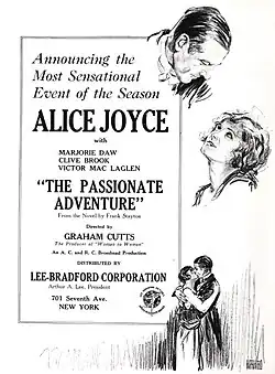 The Passionate Adventure is a 1924 British silent drama film directed by Graham Cutts and starring Clive Brook and Alice Joyce. The film was adapted from a novel by Frank Stayton by Alfred Hitchcock and Michael Morton, with Hitchcock also credited as assistant director to Cutts.[1][2]