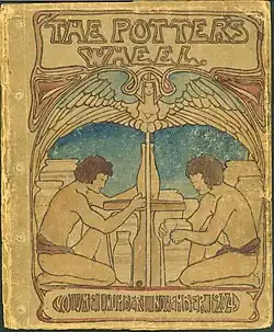The group produced The Potters Wheel magazine monthly from November 1904 to October 1907.[3] Only one copy of each magazine was produced each month,[2] "hand-lettered and hand-illustrated" by The Potters themselves.[16] Contents included poetry, fiction, photographs, and needlework.[3][16] The thick, textured pages of the hand-bound magazine were decorated with "border designs, illuminations, and watercolors".[2] The cover art often sported "mythological or fantastical scenes, in tones resembling stained glass".[2]