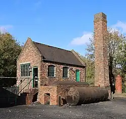 To the side of the brick engine shed is a small corrugated building which houses the engine and fan. This was installed to provide adequate ventilation in a mine. The engine is from Amblecote Fireclay Pit c1860 and was made by J. C. Stark of Torquay. It was found dismantled in the Orangery at Shugborough. The fan sucks the air from the pit. The upright part is called the evaze and is designed to dissipate the air.[4]