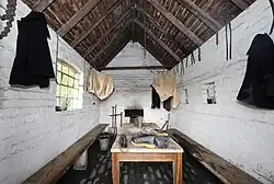 The miners' Hovel is the workmen's mess room and the place where miners could dry their wet pit clothes at the end of the day. A fire was kept lit in the hovel and wet clothes left hanging in there overnight were usually dry again by morning. The men could also brew a hot drink in the hovel, eat their 'snap'(lunch usually in a tin[6] or cloth covered bowl) or fry bacon and egg on a shovel over the fire. In some pits with a good boss, a barrel of beer may be provided to take underground.[4]