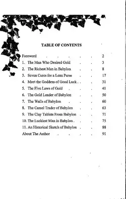 The original 1926 book groups the parables into general themes of advice, and particularly "The Seven Cures" and the "Five Laws of Gold".[3][15]