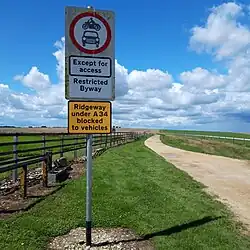 The Ridgeway's surface varies from chalk-rutted farm paths and green lanes (which have a propensity for becoming extremely muddy and pot-holed after rain) to small sections of metalled roads. Designated as a bridleway (shared with horses and bicycles) for much of its length, the Ridgeway also includes parts designated as byway, which permits the use of motorised vehicles. Local restrictions along many byway sections limit the use of motorised vehicles to the summer months. Under the Countryside and Rights of Way Act 2000, many public rights of way in England and Wales that authorities had not explicitly classified as bridleways or byways defaulted to the classification "restricted byway" which precludes the use of motor vehicles at all times, except authorised vehicles and where required for access. As a result, much of the Ridgeway remains prohibited to motor vehicle use by the general public year-round.[7] However, the Ridgeway is the only means of access for many farms, especially in the more remote parts of the Downs.