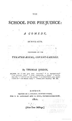The School for Prejudice is an 1801 comedy play by the English writer Thomas John Dibdin. It premiered at the Theatre Royal, Covent Garden in London on 3 January 1801.[1] The original cast included Joseph Shepherd Munden as Old Liberal, William Thomas Lewis as Frank Liberal, John Fawcett as Ephraim, Charles Murray as Counsellor Friendly, Henry Erskine Johnston as Mildmay, John Emery as John Grouse, Charles Farley as Chevy Chase, Samuel Simmons as Parchment, George Davenport as Landlord, Frances Chapman as Mrs Howard, Harriet Siddons as Marian and Mary Ann Davenport as Miss Liberal. The Irish premiere took place at the Crow Street Theatre in Dublin on 19 February 1802.[2]