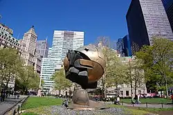 ![]() The Sphere in Liberty Park in 2018, with damage at the top of the sculpture sustained during 9/11 | |