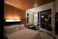 The hotel is raised 57 feet (17 m) above street level on pilotis, five massive sculptural piers, which hoist the building thirty feet over the park below. On the east side of the structure "[a] single, sloped concrete pier, along which a tantalizing set of fire stairs runs, supports the building by the hotel entrance."[2] The elevation of this structure is one clear distinction from the orthogonal street grid of Manhattan. Another was hinging the two concrete slabs which make up the structure. The hinge technique was not only a stylistic choice but also a functional one. Because of the angle of the two slabs all 338 guest rooms have unobstructed views of Manhattan: the New York City skyline, the Hudson River or the Empire State Building. Balazs explains the choice for hinging the slabs as such: "It [allowed] us to squeeze in an extra room per floor, but more significantly, it provides a variety of view corridors while retaining as many views as possible of the Empire State Building."[2]