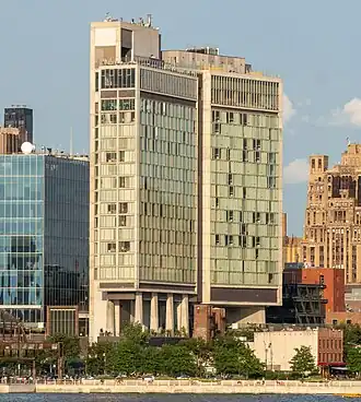 The style of the building is best related to the architectural vocabulary defined by Le Corbusier. There are numerous references to his style of building, from the use of the pilotis, to the incorporation of public space, the use of a glass curtain wall façade, and the utilization of the rooftop, which now houses a bar called Le Bain.[3] These features also speak to the principles of the International Style. Joseph Minutillo notes that some of the references to Corbusier were intentional, while others may not have been. For example, "an elevated pedestrian zone slicing through the building [is] reminiscent of Le Corbusier’s multistreet-level designs for La Ville Radieuse."[2]
