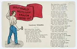The English translation by M. L. Korr, published in 1932 is not based directly on the original French lyrics, but on the substantially modified Polish 1882 version by Bolesław Czerwieński, titled „Czerwony sztandar“ ("The Red Standard"), which became the anthem of the Polish Socialist Party. Czerwieński's lyrics were also the basis for Czech, German, Hungarian, Latvian, Romanian, Russian, Ukrainian, Yiddish and other translations.[2]