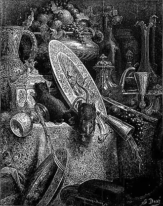 By contrast, the adaptation in La Fontaine's Fables, Le rat de ville et le rat des champs (I.9), is simply told.[14] There it is the town rat that invites the country rat home, only to have the meal disturbed by dogs (as in Horace); the country rat then departs, reflecting, as in Aesop, that peace is preferable to fearful plenty.