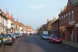 Theale before the 20th century was an early example of ribbon development, in that the built-up area was a long strip along the Bath Road with no side streets. The layout focuses on the crossroads formed by the High Street (east), Church Street (west), Blossom Lane (north) and Station Road (south). The High Street is completely built up with mainly Victorian edifices in red brick, some in patterned brickwork and some rendered in lime plaster. It is a conservation area. Listed buildings earlier in date are 1, 4, 29, 31, 33, 35, 37, 43–5, 47, 48, 49, 50, 52, 58, 60.[33] Of these, seventeenth-century timber framed buildings are 29, 33, 35 and 52; the others are Georgian or Regency. 29, 31 and 47 are old coaching inns (31 still open as The Falcon). 49 has an unusual Gothic door-case.[34]