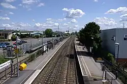 Theale has a railway station on the Reading to Taunton line; the station has been in operation since 1847.[55] Until 2013, the layout consisted of two platforms, the eastbound to Reading via Southcote Junction and Reading West and the westbound to Newbury via Aldermaston, Midgham, Thatcham, and Newbury Racecourse. Some trains run past Newbury to Kintbury, Hungerford and Bedwyn. Until 1963, local services ran to Trowbridge via the so-called Devizes branch line which was closed in that year. The station had a siding for general goods (freight) services on the north side to the east of its yard, and a pub called the "Railway Arms" at the yard entrance. Aggregate traffic (sand and gravel) used a terminal to the west, and this remains open.
