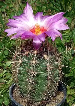 Plants are usually solitary, but may form clumps.[2] It typically grows to about 6 to 10 centimeters in diameter, growing to 50 cm (20 in) tall, it is a perennial with succulent stems with a blue or gray-green body that is somewhat felty at the top and often thorny. The cactus has 8 to 13 straight or twisted ribs, each divided into crookedly truncated cusps up to 1.5 centimeters high. It also has 9 to 18 marginal spines that are protruding or slightly curved and up to 3 centimeters long, as well as 1 to 4 central spines that are all up to 3 centimeters long. The central spines are brightly colored, white or reddish in the middle, or red at the base and yellow at the tip, gradually becoming grayish with age. The lowest central spine is stretched out and prim, while the upper ones are erect and flat. Large daisy-like flowers, 5–8 cm (2.0–3.1 in) in diameter with ciliate edges, are borne in summer. The petals are purplish-pink, fading to white. The inner petal tips form a circle of red surrounding a prominent yellow boss. The fruits are reddish-brown, scaly, and edible.[3]